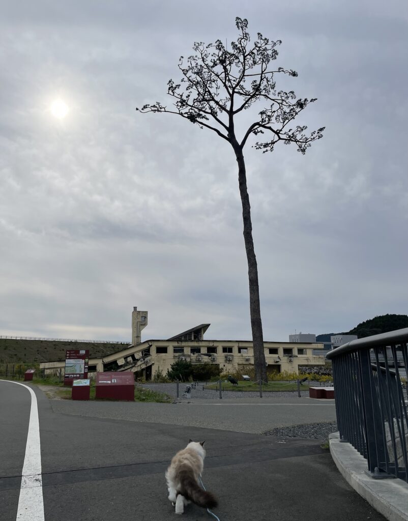 奥に写っているのは津波で崩壊したユースホテル